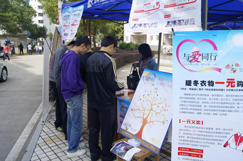 11月3日、4日,为帮助贫困山区的孩子们,我校有志者爱心同盟协会开展了暖冬衣物募捐活动,此次活动安排在升华广场、南校区大门、本部静怡园、本部高家坪、本部西苑菜市场和本部三食堂前广场六个据点同时进行。